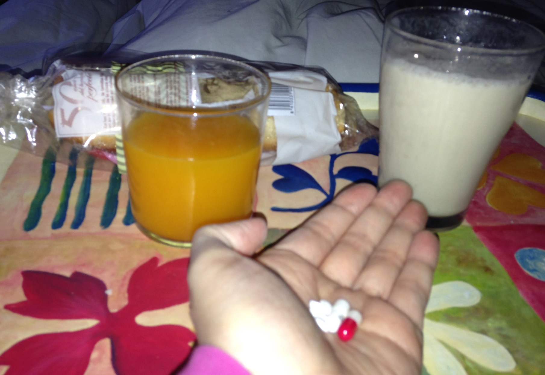 Día tranquilo, empezando por un estupendo desayuno de «la terreta» (Castellón) un buen zumo de naranja natural, horchata y fartons (son unos bollos deliciosos tipicos para mojar en la horchata). Y para acompañar un delicioso cóctel de pastillas! jajaja. Todo ello servido en la cama por mi amor! Que mas se puede pedir???