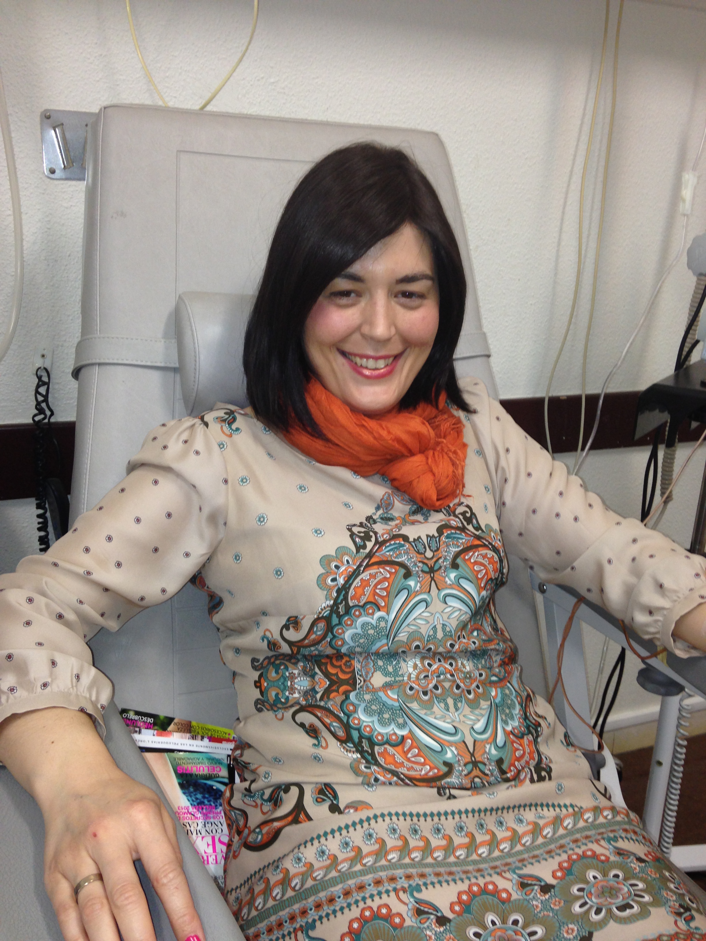 Imagen de mi movil, yo con peluca un dia de quimio, esta mañana iba igual vestida (pero ahora estoy muchiiiiiiiiiiisimo mejor!)